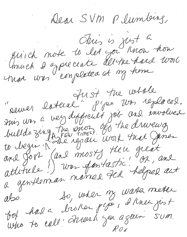 Dear SVM Plumbing, This is just a quick note to let you know how much I appreciate all the hard work that was completed at my home. Just the whole “sewer lateral” pipe was replaced. This was a very difficult job and involved bulldozing the snow off the driveway (a few times) to begin. The repair work that James and Josh (and mostly their great attitude!) was fantastic! Oh, and a gentleman named Ted helped out also. So, when my water meter box had a broken pipe, I knew just who to call! Thank you again so much.