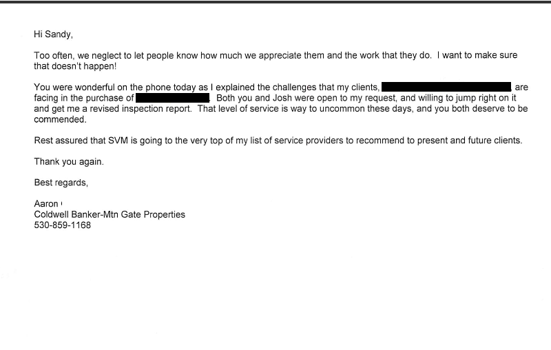 You were wonderful on the phone today as I explained the challenges that my clients... are facing in the purchase of... Both you and Josh were open to my request and willing to jump right on it and get me a revised inspection report. That level of service is way to uncommon these days, and you both deserve to be commended.
