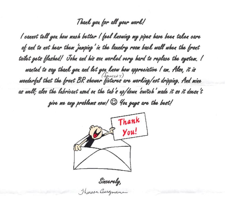 I cannot tell you how much better I feel knowing my pipes have been taken care of and to not hear them 'jumping' in the laundry room back wall when the front toilet gets flushed! John and his son worked very hard to replace the system. I wanted to say thank you and let you know how appreciative I am. Also, it is wonderful that the front BR shower fixtures (faucets) are working/not dripping. And mine as well; also the lubricant used on the tab's up/down 'switch' made it so it doesn't give me any problems now! :) You guys are the best!